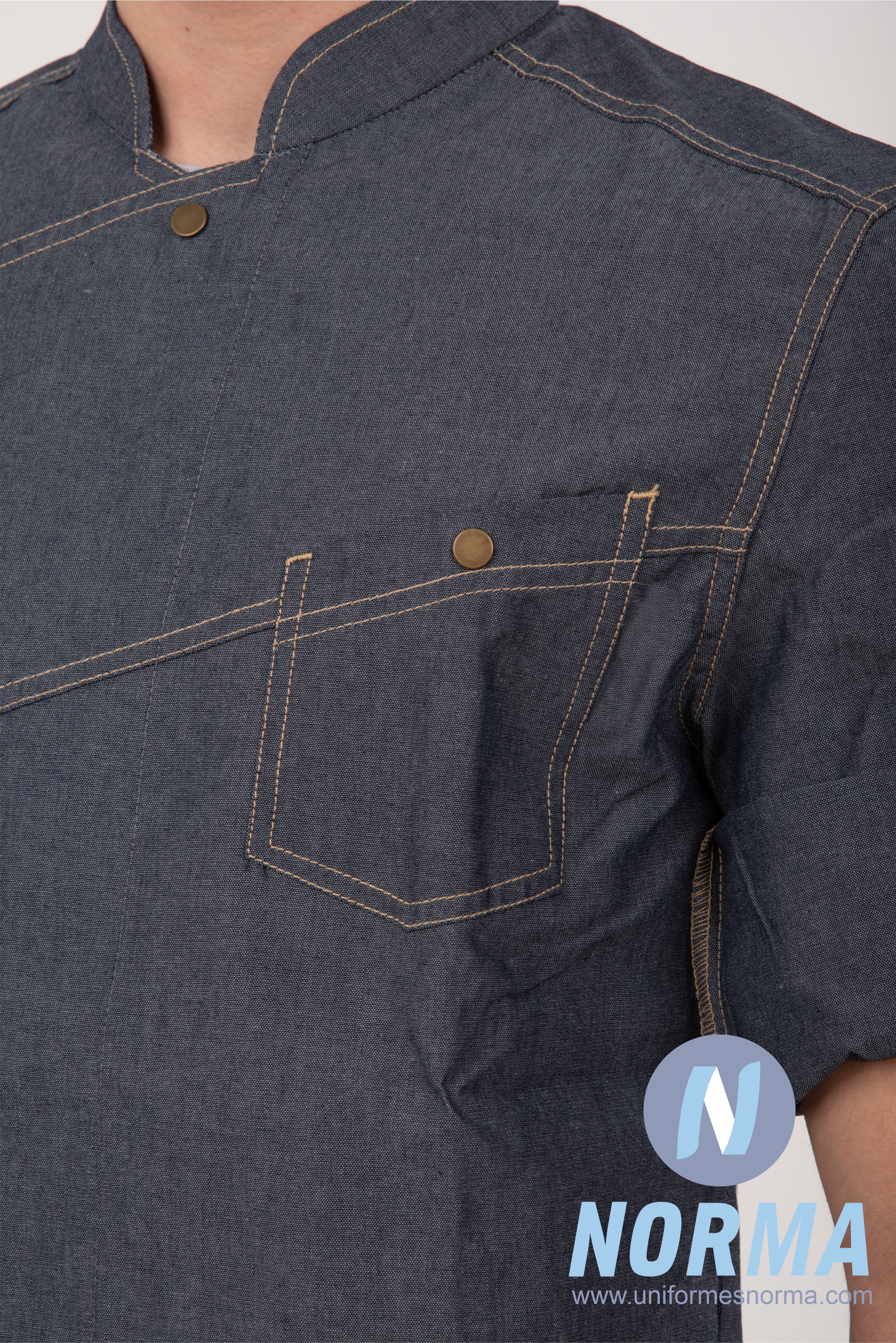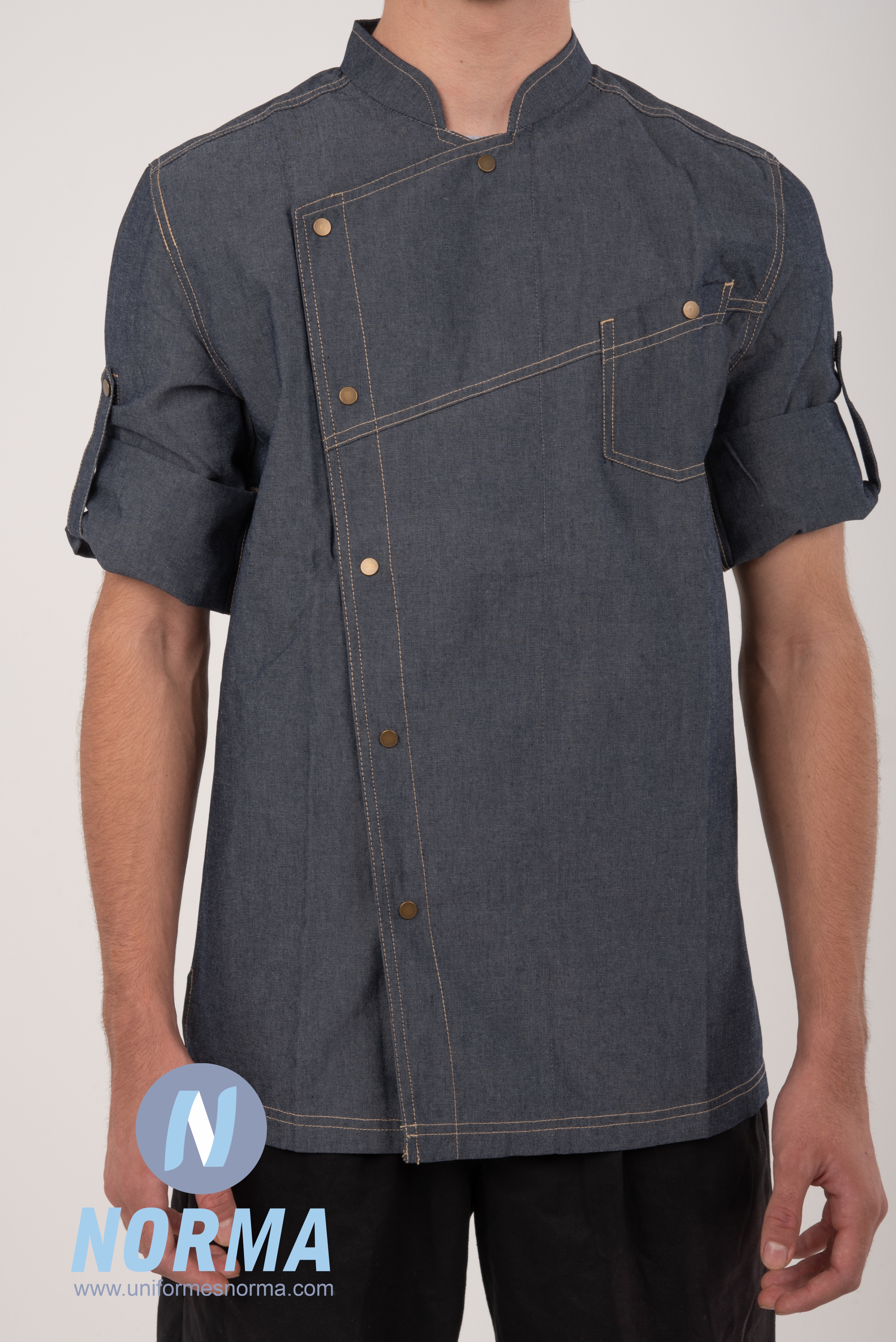 Filipina para chef en mezclilla con botones de presión. Cuenta con un diseño único de incomparable estilo y calidad. ¡Sus detalles y funcionalidad harán que resaltes en tu cocina!. Manga tres cuartos arremangable. Doble cierre de presión al pecho con botones en metal. Doble costura en contraste en toda la prenda. Bolsillo en parche en frente izquierdo. Tela mezclilla: 65% poliéster, 35% algodón; 200 g./mt2.
