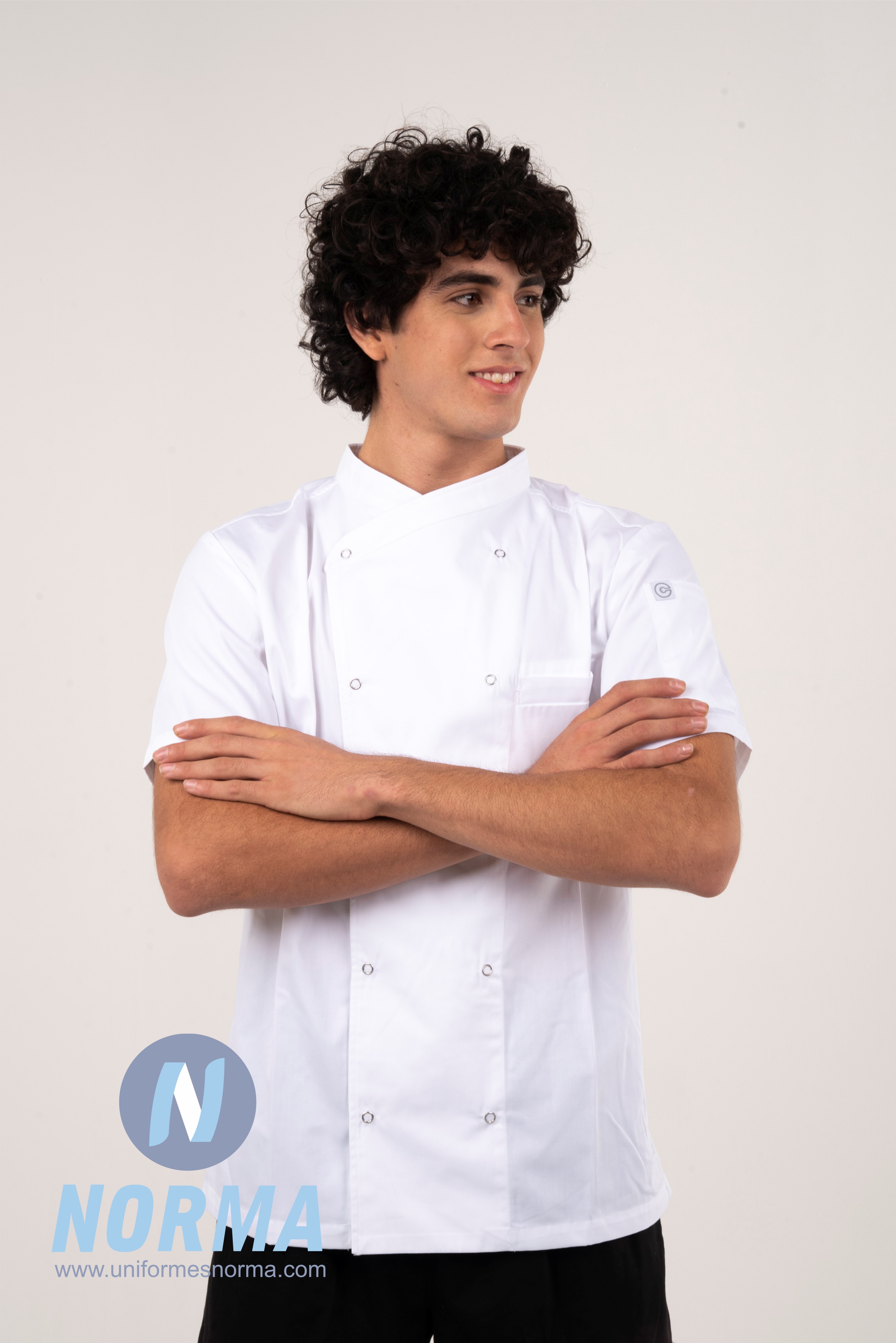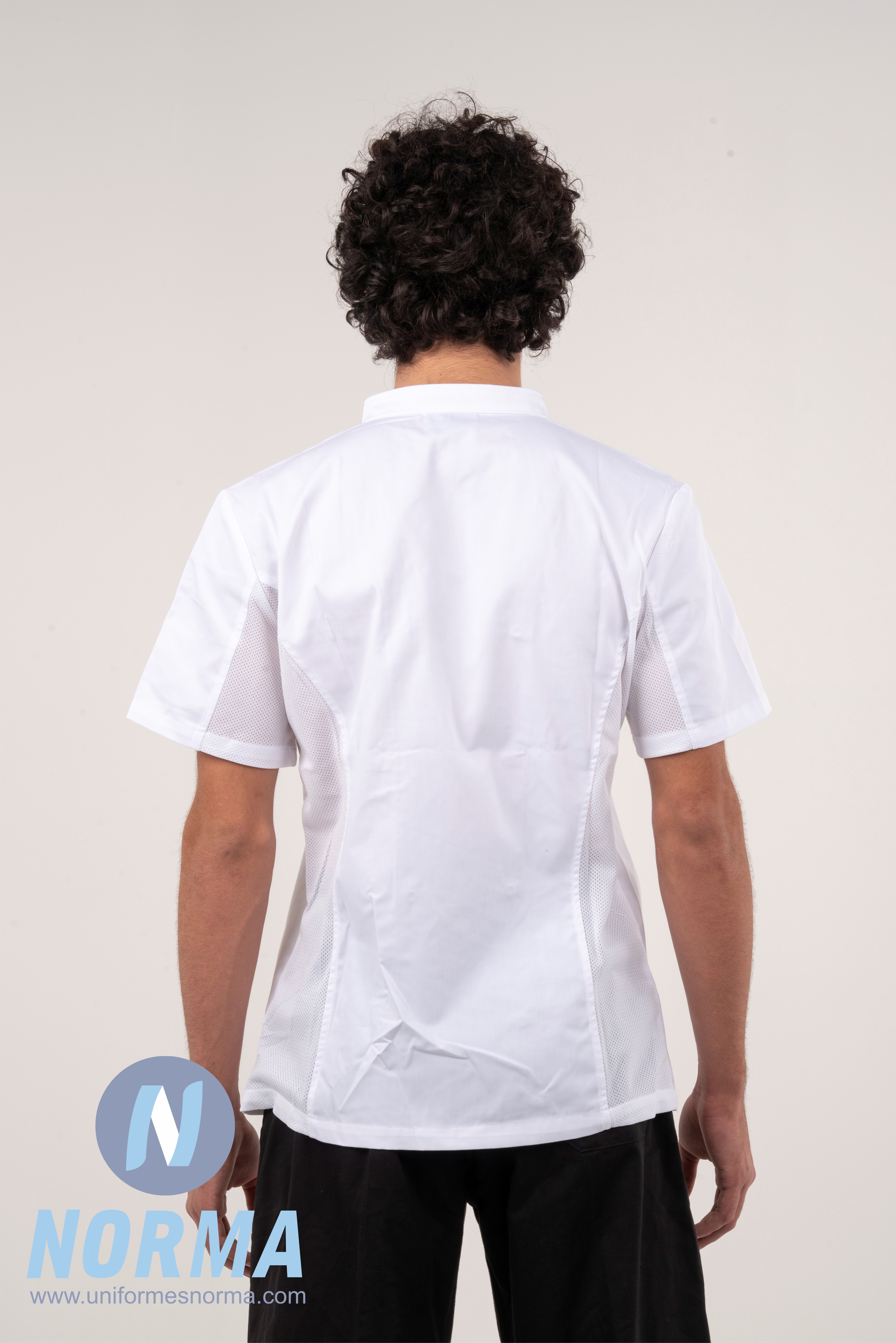 Filipina para chef cuello cruzado con tela especial para clima cálido: Cool Vent. Prenda ideal para climas o condiciones de trabajo calurosas. Su tela con exclusiva tecnología japonesa de ventilación permite la permeabilidad y evaporación del sudor, incluso con más rapidez que el algodón. Manga corta. Cuello cruzado. Doble cierre de presión al pecho. Páneles laterales en malla bajo el brazo para óptima ventilación. Bolsillo al frente izquierdo y en brazo para termómetro. Tela gabardina: 65% poliéster 35% algodón; 200 g/mt2.