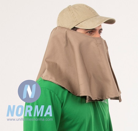 Gorra con capa en la nuca tipo legionaria. Confeccionada en gabardina para una mayor frescura y aislamiento al calor, resistencia al desgarre u objetos punzo cortantes. Se confecciona con una capa en la parte trasera para proteger al usuario del sol en su nuca. Su ala ancha al frente protege la cara y orejas del sol. Cordón con barbiquejo y ajuste a la cabeza. Malla en la parte superior para poder transpirar.