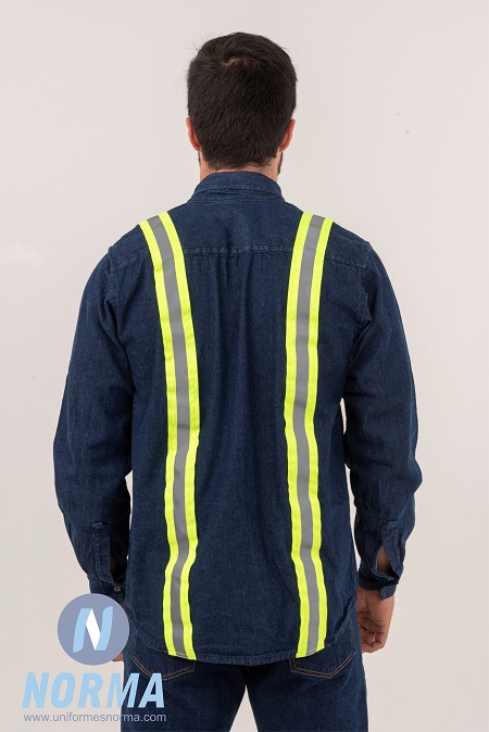 Camisa de trabajo de alta reflectividad modelo Work 2. Esta camisa viene con reflejantes ya incluidos en color amarillo-plata en 2” con la finalidad de tener contraste de colores y el usuario sea altamente visible en el día y con el reflejante plata, por las noches en menor grado. Esta camisa esta diseñada para las personas que están en áreas de trabajo con alto flujo vehicular o dentro de industrias que requieran una visualización rápida del personal.