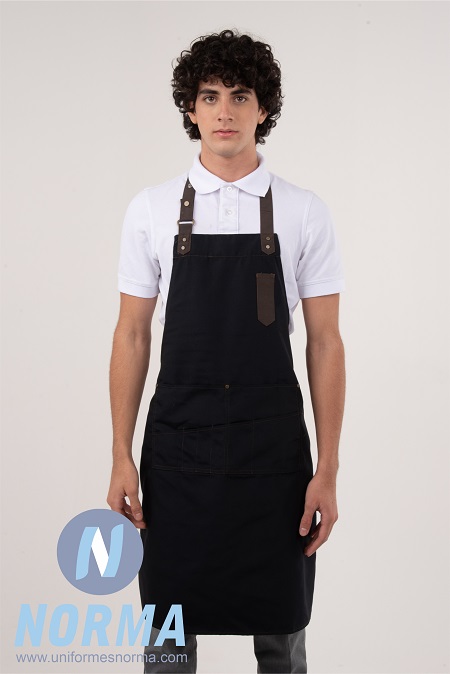 Una identidad muy fresca y única da este mandil con pechera. Confeccionado en loneta ligera 100% algodón que da protección evitando las manchas y salpicaduras. Remaches en hilo y metálicos. Tiene correa para ajuste al cuello y en cintura en material de tela café. Ajuste en cuello con broche de presión. Dos bolsas en parte frontal inferior dividida en dos, para comanda y plumas. Y una en parte superior para pluma. Colores disponibles Negro con contraste café.